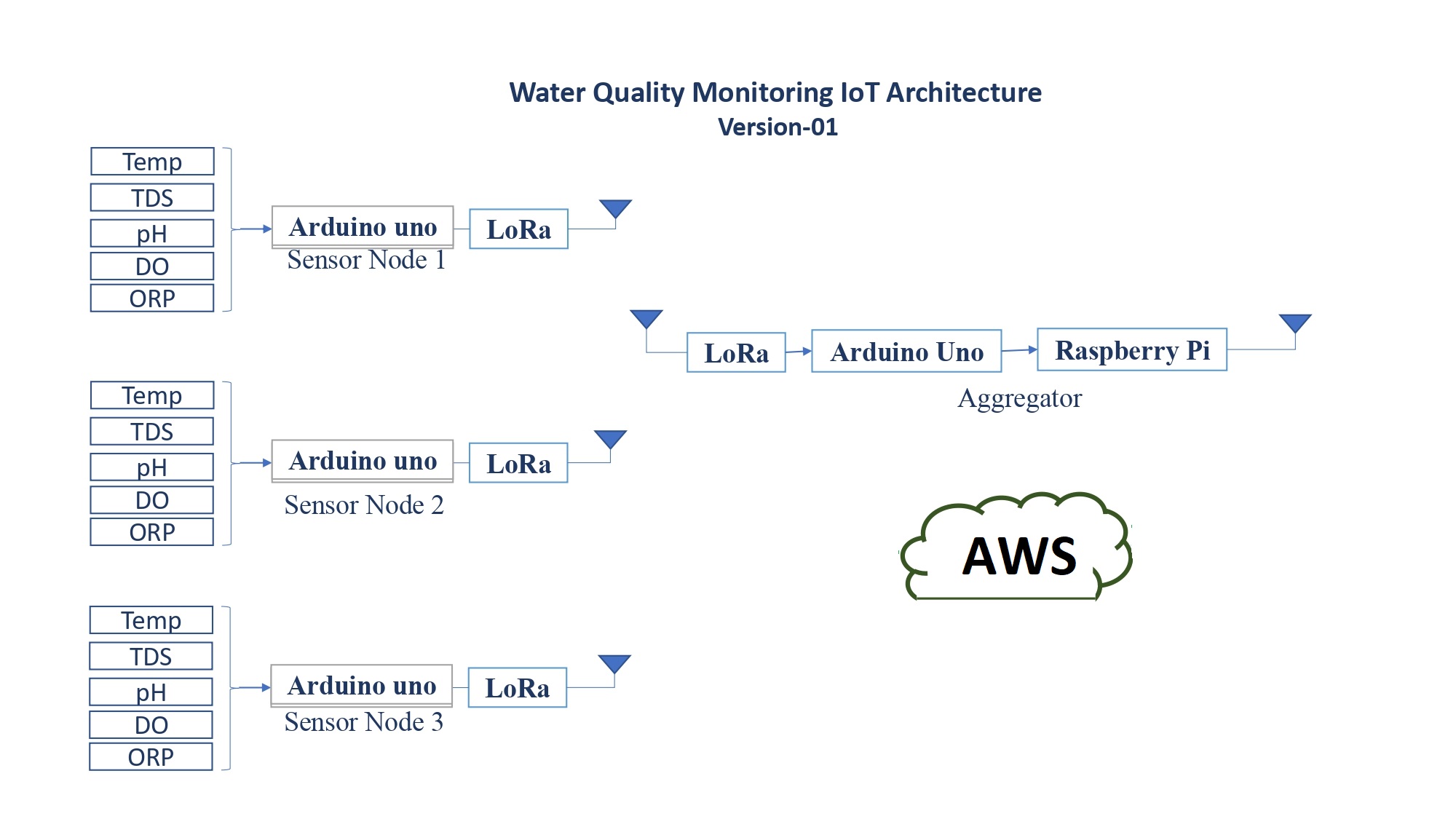 Visualize water quality parameters in cloud platforms and mobile applications which have been collected from various remote sensing nodes. Sensor nodes will have one controller to collect data from various onboard sensors, then packetize and send the data to the aggregator through a local ad-hoc wireless network. Aggregator will collect data from all sensing nodes and will send them to the cloud environment using a wifi module. Same data can be fetched from the cloud platform and will be visualized in user-friendly mobile applications. Machine learning based algorithms needs to be implemented on hardware or on web server to predict the water quality, predictive actions, warning conditions, alarming conditions and so on.